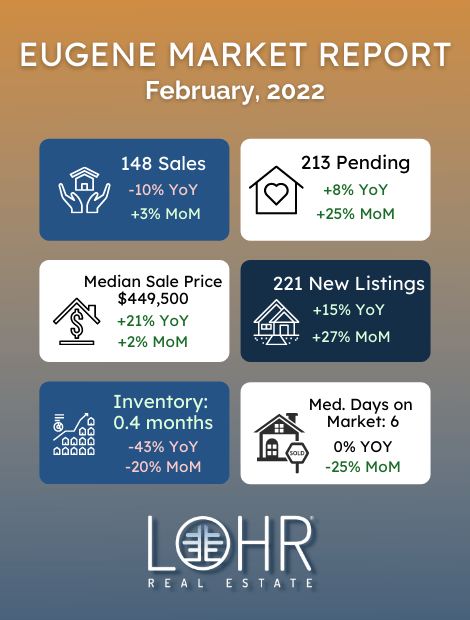 That’s fairly typical for the colder season here, but it’s also something to pay attention to. Buyer activity is down more than new listing activity year-over-year. As a result, inventory is up to 2.2 months. In November, $600k+ properties spent a median of 36 days on the market, compared to 22 days for all Eugene homes.